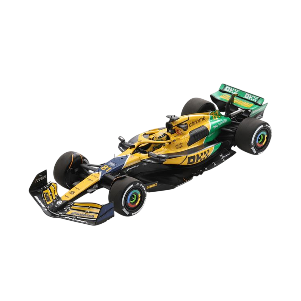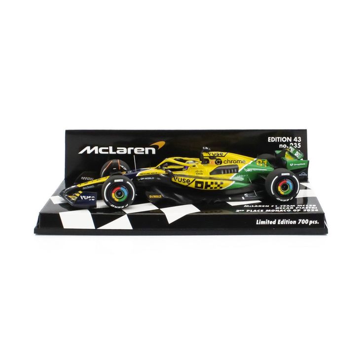 د.إ99.001:43 Formula (with Helmet & Plastic Stand) – McLaren Team MCL38 (Monaco GP 2024 – Senna Livery)